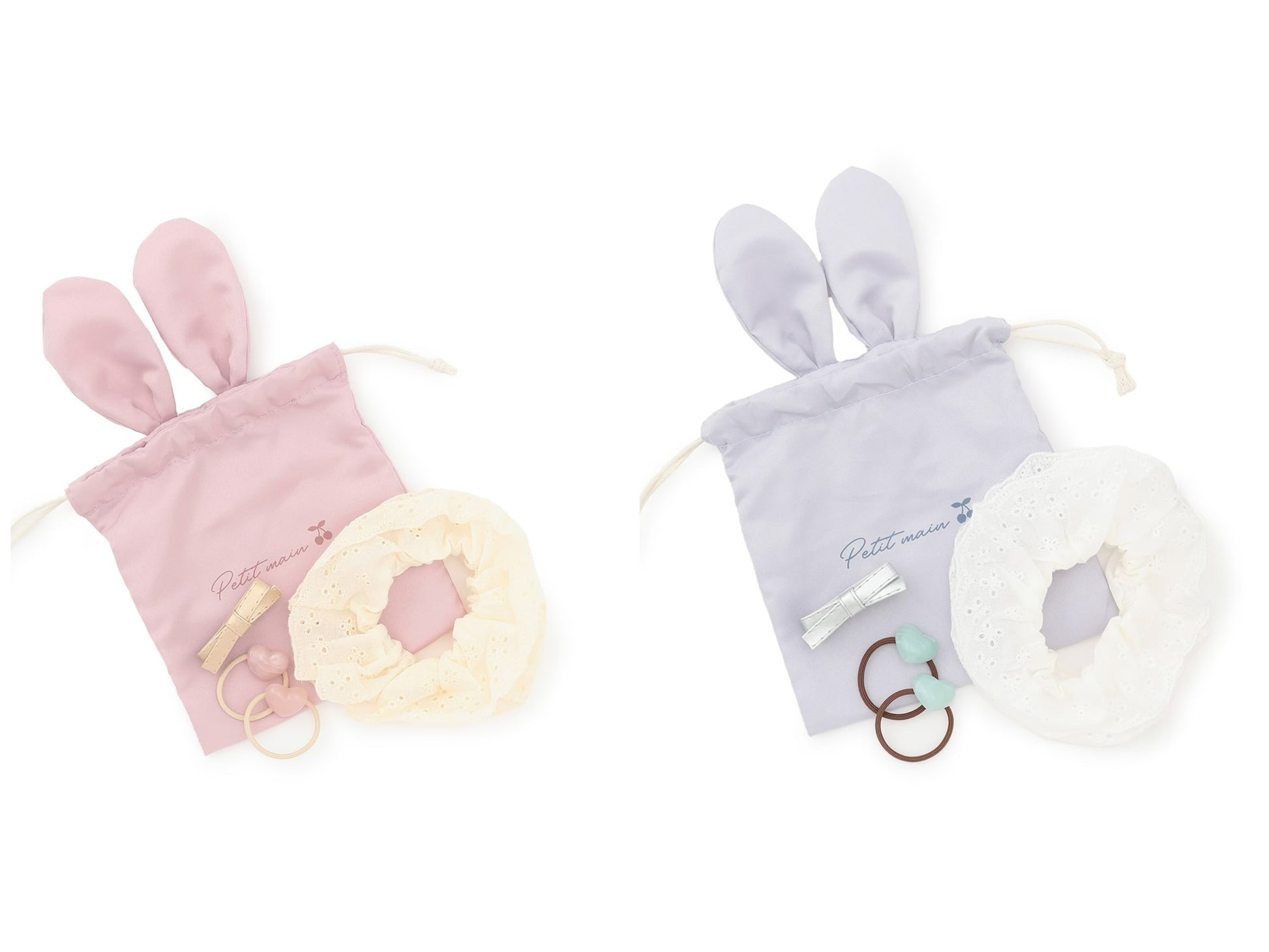 - 巾着:ポリエステル100% シュシュ:綿100% (テープ部分):ポリエステル100% ヘアクリップ:合成皮革 ヘアゴム:プラスチック