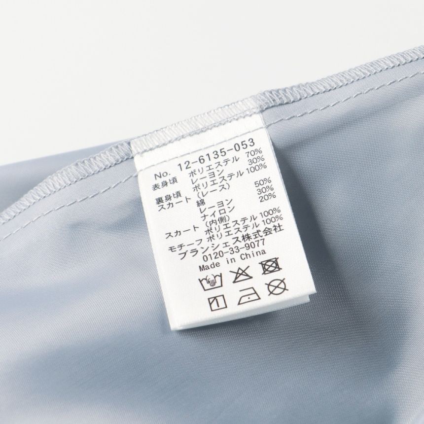 - 表身頃:ポリエステル70% レーヨン30% 裏身頃:ポリエステル100% スカート(レース):綿50% レーヨン30% ナイロン20% スカート(内側):ポリエステル100% モチーフ:ポリエステル100%